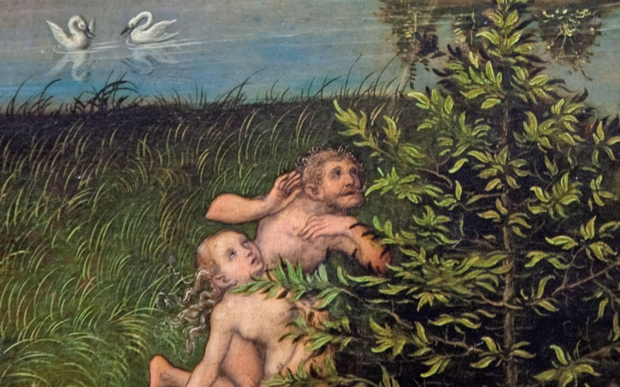 果実を食べたことが神様に見つかったら怒られますから、バレないように近くの茂みに身を隠して息をひそめる。二人はずいぶん可愛らしい行動をします。